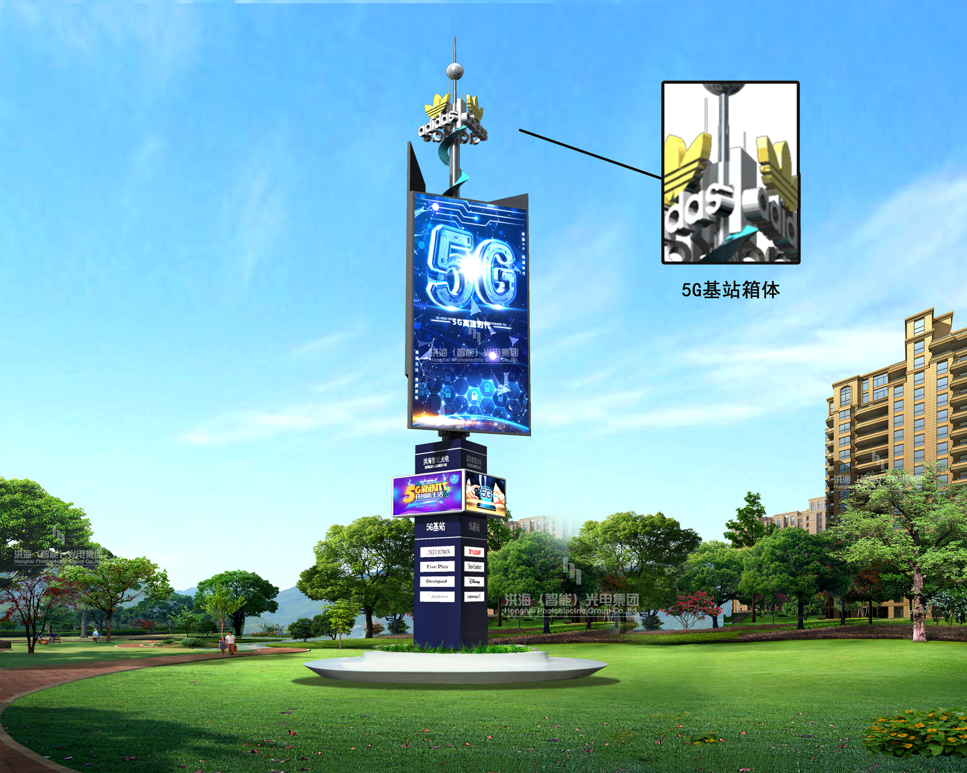 (4)洪海5G智慧燈桿螺旋旋轉屏是智慧城市的一部分,所以大數據的收集與分析是功能之一,同時還要具備音響、WIFI、亮度自動調節、同步切換、探針、節能、溫控、監控、5G,等等