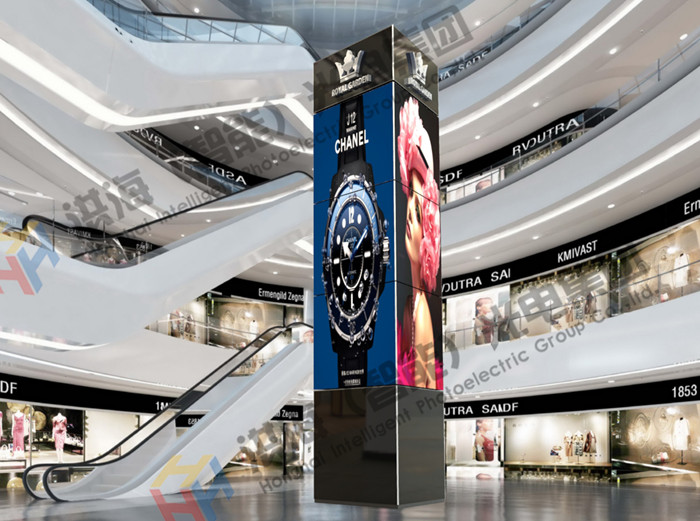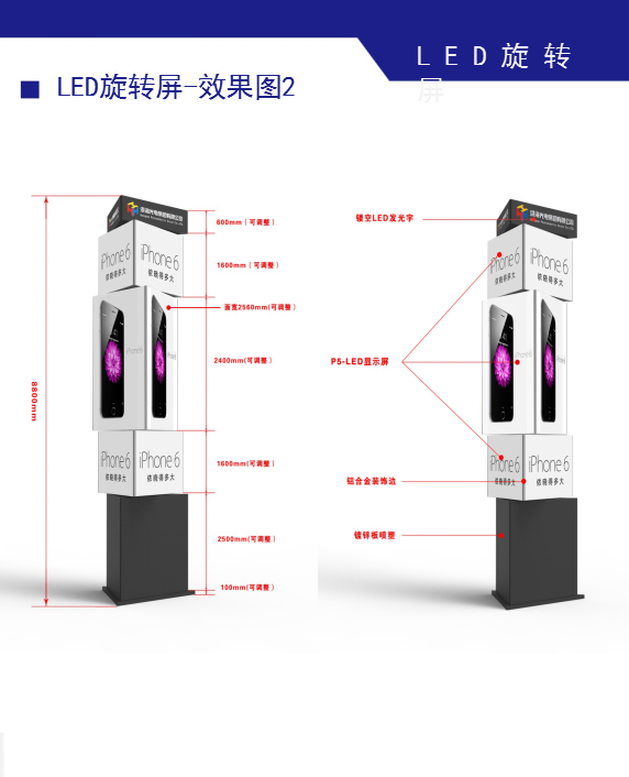 LED旋轉屏以靈活多變的旋轉姿態吸引著人們的注意,其結構整體為三角柱體形狀,中間視頻顯示部分由三層三角形LED箱體構成。在旋轉系統的控制下,三個led屏體相互配合,旋轉動作與視頻畫面協調運作,三面共九個小led顯示屏可單獨播放視頻,也可拼接為三個視頻或將三面三層LED拼接為一個整體視頻播放。動態屏幕與視頻畫面完美結合,為人們帶來震撼的視覺沖擊力,進而促進投放戶外廣告的有效傳播。