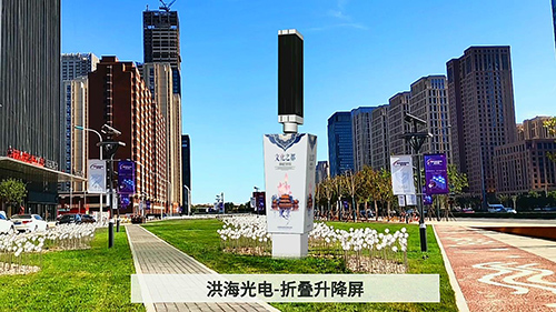 當升降折疊屏不工作的時候,外面像一個廣告柱子,可以做標牌使用。